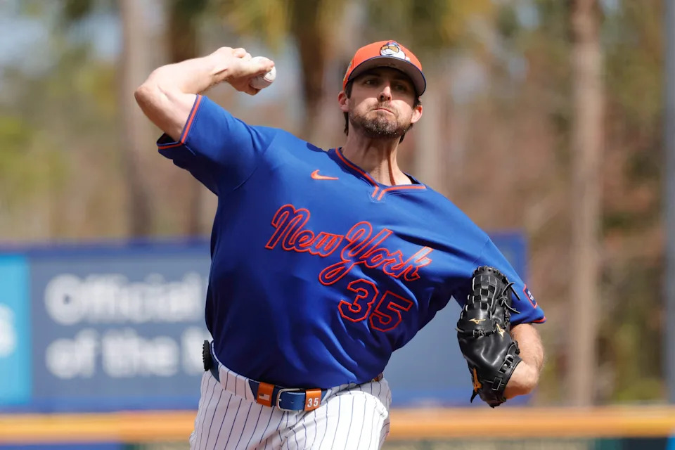 Feb 17, 2026; Port St. Lucie, FL, USA; New York Mets pitcher Clay Holmes (35) delivers a pitch during spring training at Clover Park. Mandatory Credit: Sam Navarro-Imagn Images