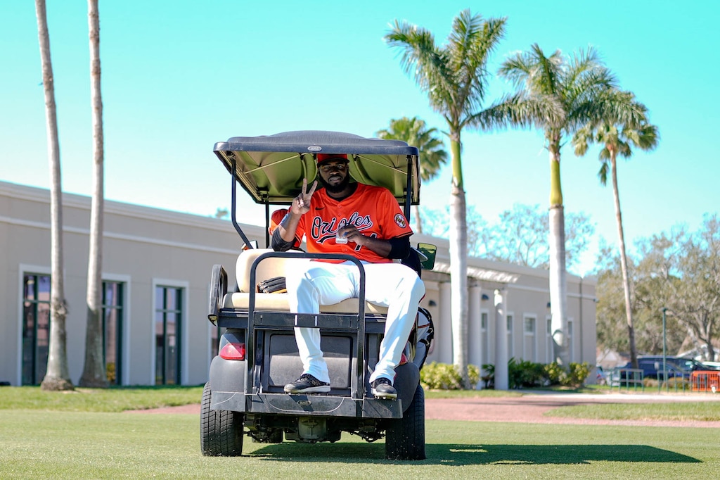 Félix Bautista flashes a peace sign while riding on a golf cart during spring training in February. (Ulysses Muñoz/The Baltimore Banner)