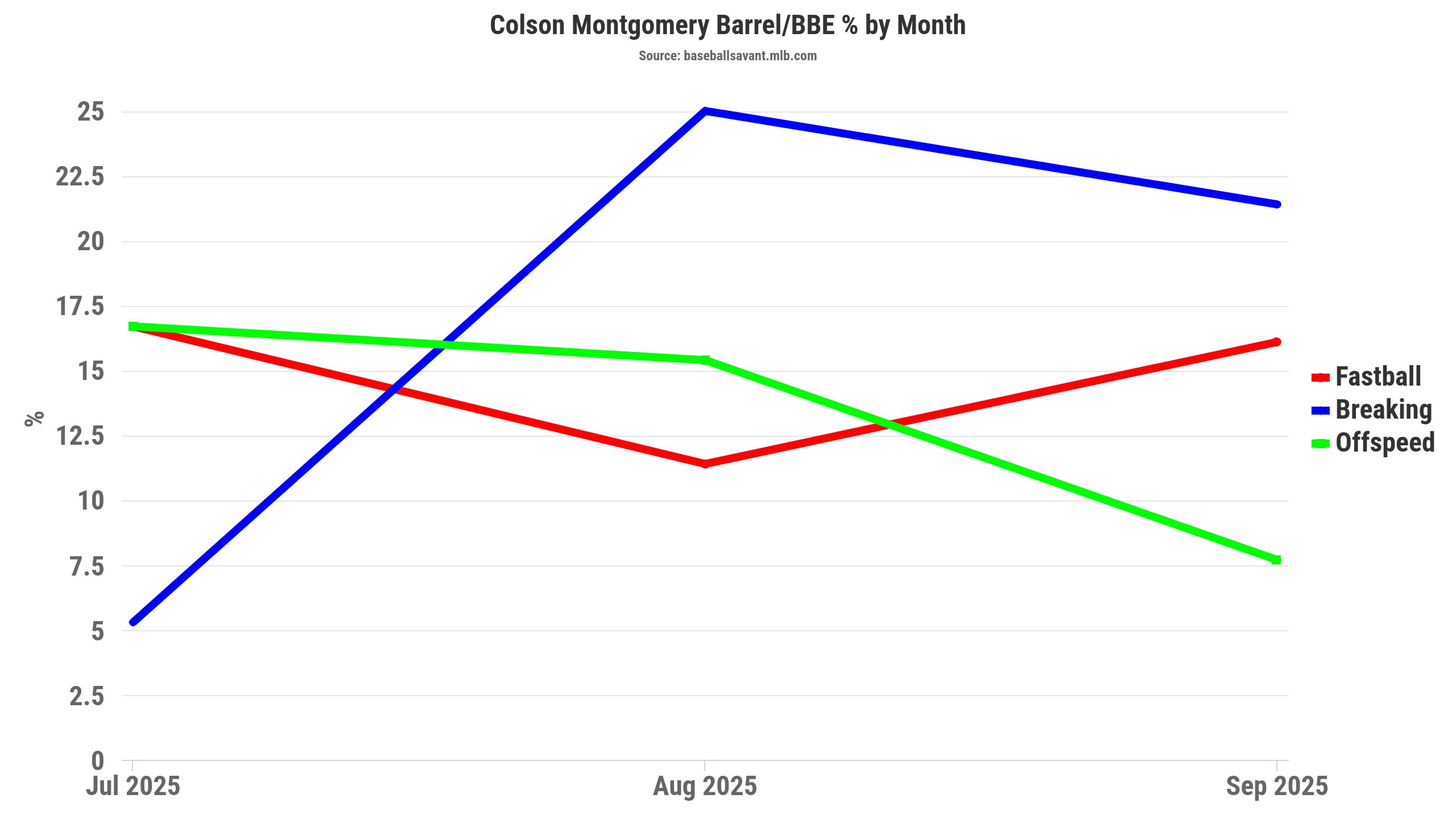 Montgomery does not profile as a shortstop who will help you with batting average and steals. But what he can do is hit for power. Check out Montgomery’s barrel percentages in a 284 plate appearance sample. The 23-year-old slugged 21 home runs.