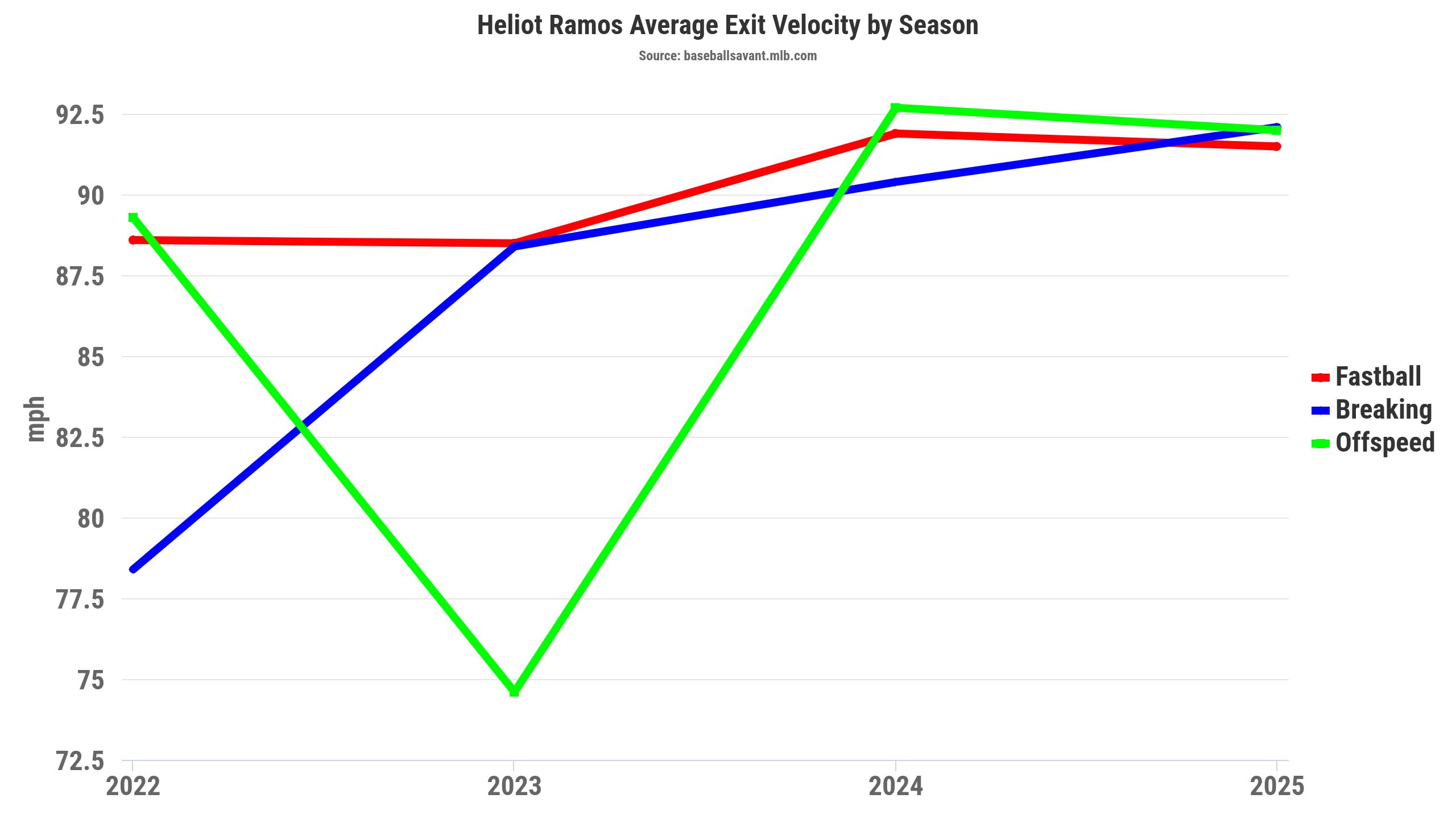 What I like when I dig in is that Ramos hits the ball hard; his average exit velocity is elite (see below). Digging a bit deeper, the K% has decreased annually, reaching a career low of 22.7% in 2025. He has elite bat speed as well, and he’s entering his age-26 season.