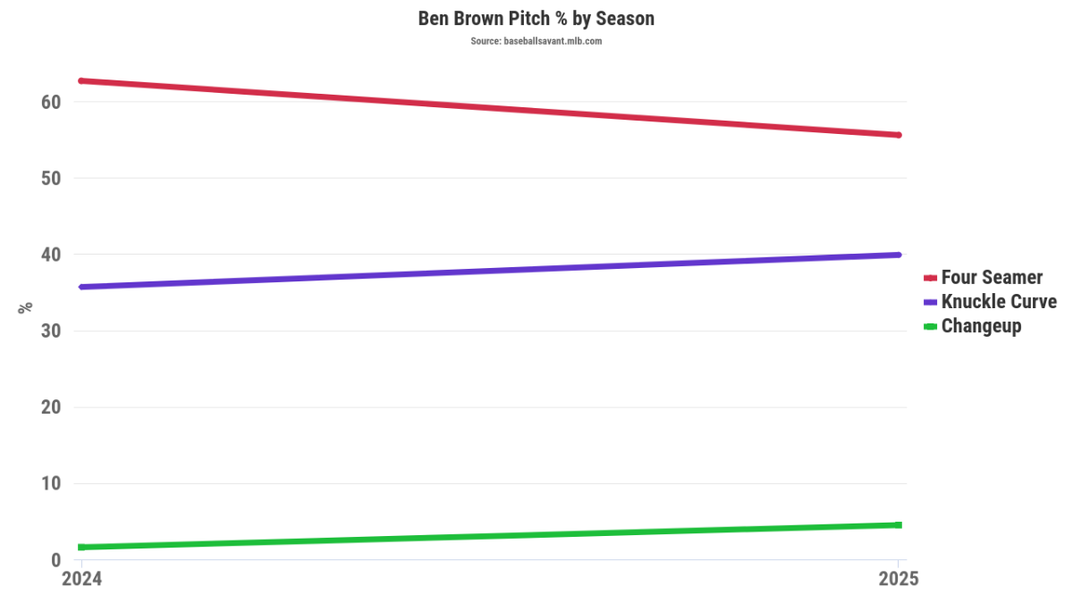 Much of Brown’s past struggles can be traced to his limited pitch mix. His .323 career BABIP allowed and 12.9% home-run-to-fly-ball rate may stem from being mainly a two-pitch pitcher. Allowing a .351 wOBA to lefties, compared to .291 to righties, shows the need for a third offering, particularly one that runs away from the former.