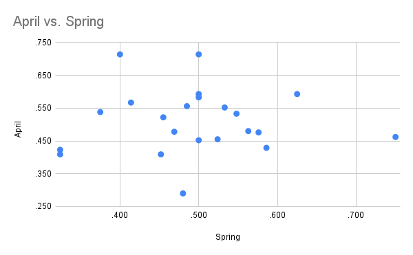There is an argument to be made that there is a connection, but it’s diluted by time. After all, the Opening Day roster for the D-backs in 2025, was radically different from the one which took the field after the trade deadline. [As a rough check, of the fourteen players to appear in the D-backs’ August 1 game against the Athletics, only half were on the Opening Day roster] So, let’s plot Arizona’s spring training record against what the team does at the very start of the season, with their record through the end of April that season. Maybe that will show a greater degree of correlation?