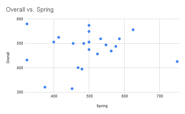 Ok, I guess I should probably show my working a little bit. So what I did was gather up the D-backs’ spring training results for each season since 2003 (which is where ESPN’s statistics begin), with the exception of 2020 – when both spring training and the regular season were kinda half-assed. I took the win percentage of the team that spring (ties, which are a thing in the Cactus League, were discarded) and plotted it against the regular season record for the same year. If there was any kind of correlation, you’d expect there to be a visible line. Here’s what the graph actually looks like:
