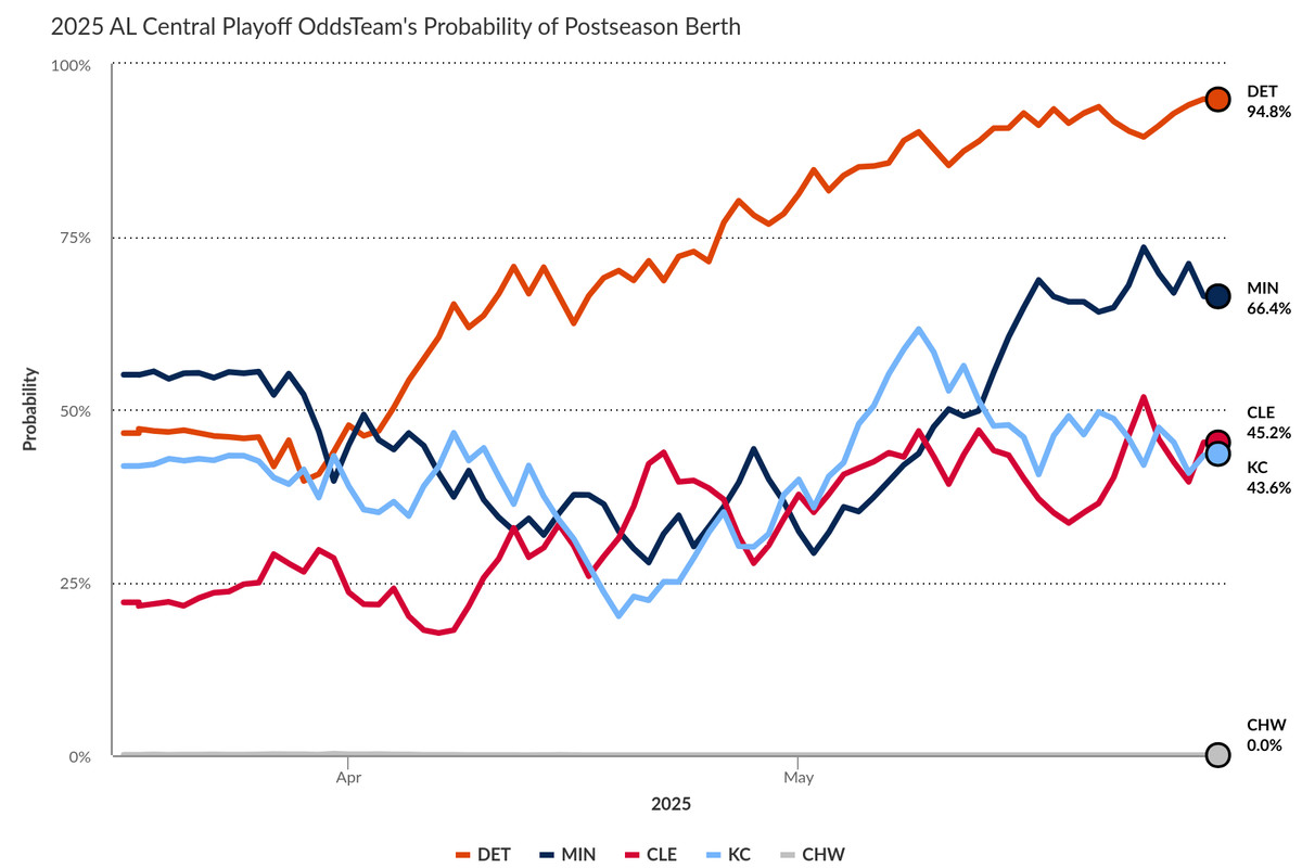 The Twins are not in first place in the AL Central standings, but they are now tied for 2nd place with Cleveland, six games behind Detroit as of this writing. That’s good enough for an American League wild card spot if the season were to end today and FanGraphs’ modeling shows the Twins have a roughly two-in-three chance to make the playoffs:
