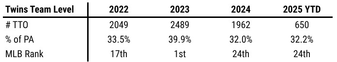 With about a third of the season in the books, I wanted to check in on the Twins’ offensive reliance on the three true outcomes — home runs, walks, and strikeouts. Readers will recall the strikeout record-setting 2023 club led all of baseball in the share of plate appearances that ended with one of those outcomes. That season now appears to be more of a product of circumstance and not a manifestation of a tightly held, enduring organizational philosophy: