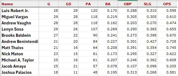 Courtesy of B-Ref, here are the slash lines for the 12 White Sox hitters with the most plate appearances at the beginning of May 1: