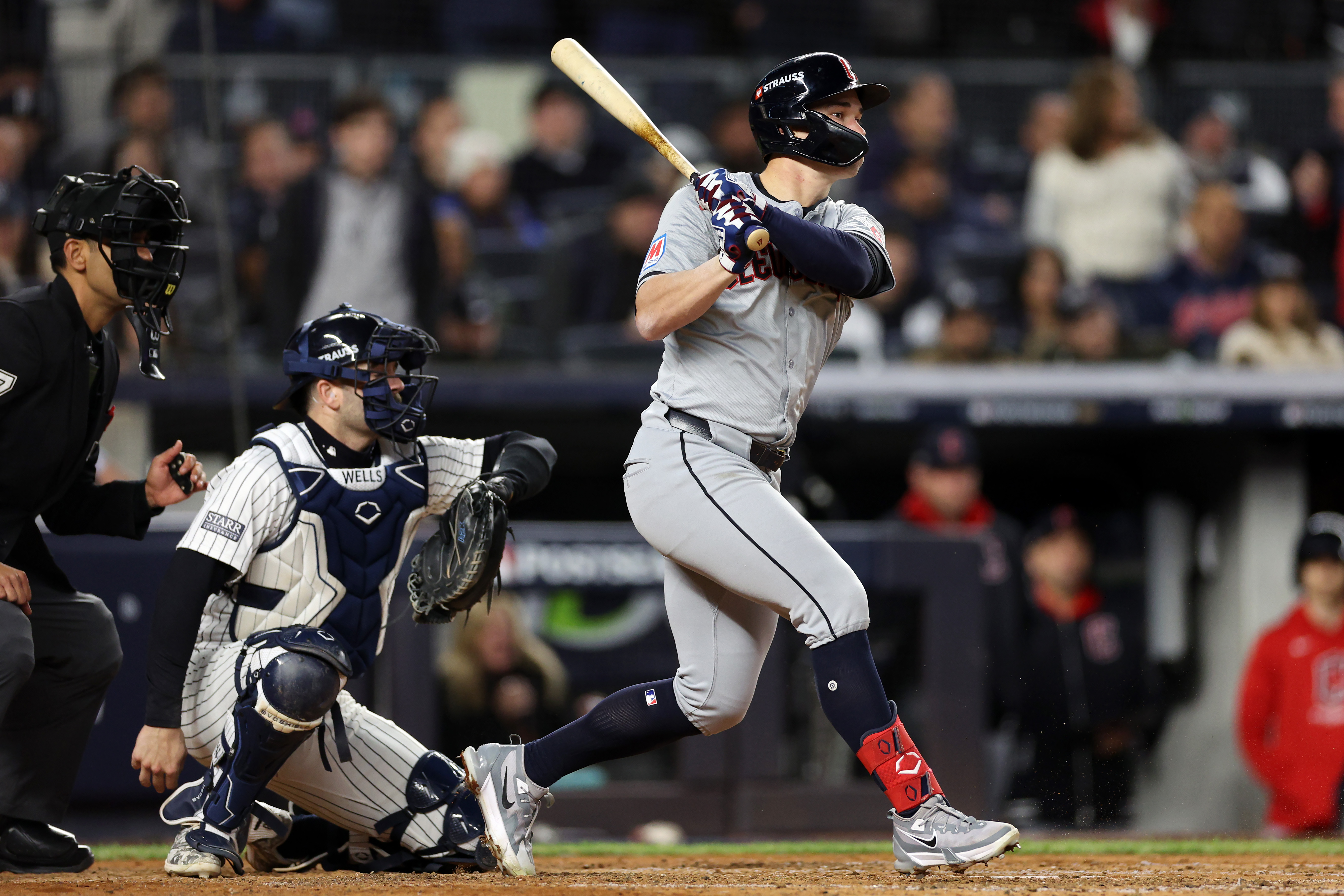 GettyNEW YORK, NEW YORK – OCTOBER 15: Will Brennan #17 of the Cleveland Guardians hits a single in the fifth inning against the New York Yankees during Game Two of the American League Championship Series at Yankee Stadium on October 15, 2024 in New York City. (Photo by Elsa/Getty Images)