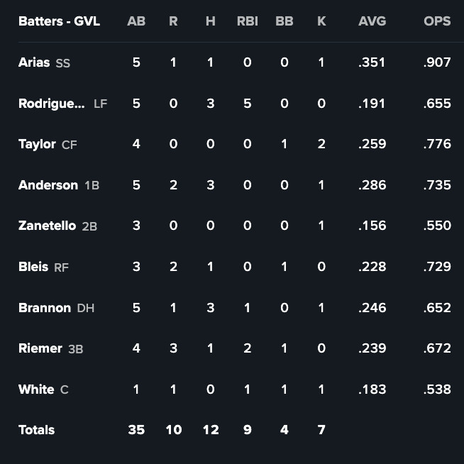 Greenville: W, 10-7 (BOX SCORE)