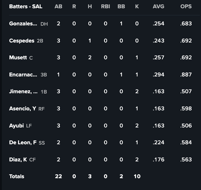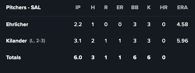 The only thing keeping me from saying “a loss in a one-run game? What are they, the Red Sox?” is that Salem’s squad got shutout. This is especially disheartening because the pitching staff only allowed three hits (albeit in only six innings). One of those hits was a double, though, and that did them in, as the Sox also only racked up three hits on the night.