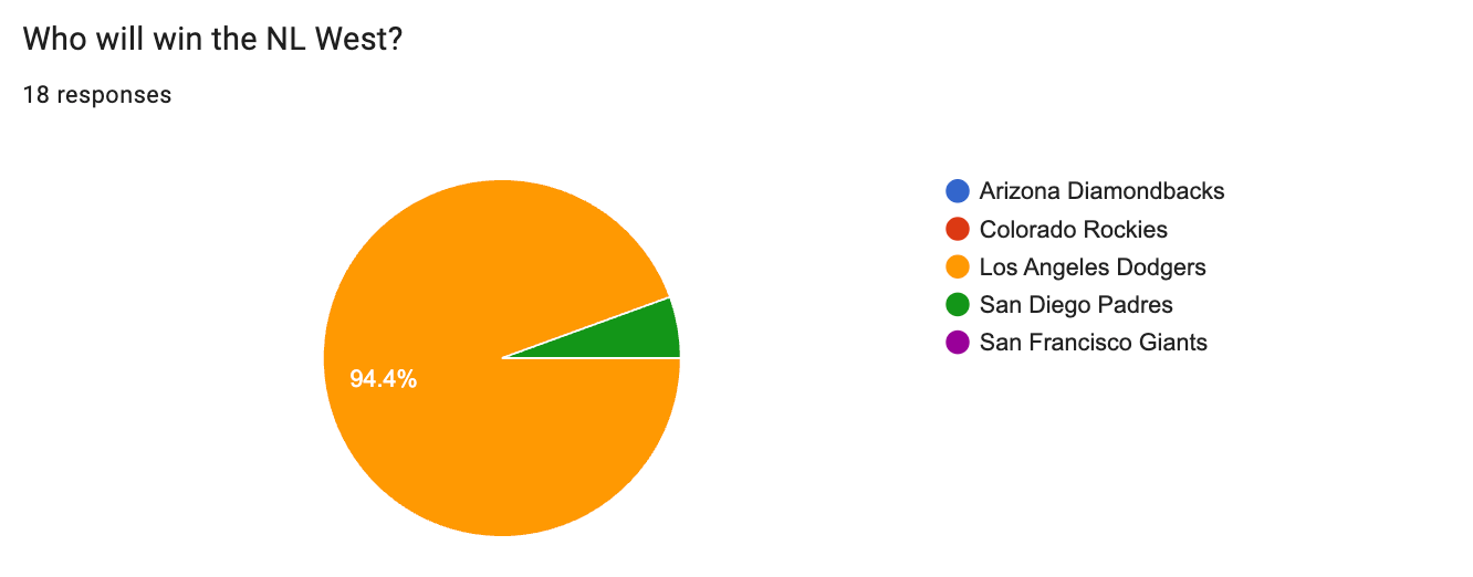 However, 17 out of 18 voters predict the Los Angeles Dodgers will once again be Kings of the NL West. The San Diego Padres received the other vote.