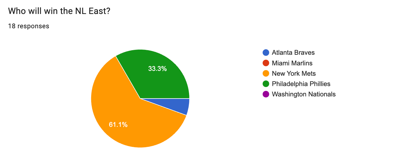 In the NL East, though, the overwhelming majority of the community think the New York Mets will take the crown. The Philadelphia Phillies got six votes, and the Atlanta Braves got one.