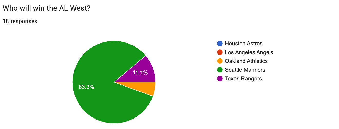 In the AL West, 15 out of 18 respondents voted for the Seattle Mariners. The Texas Rangers received two votes, while the Not-Oakland Athletics received one.