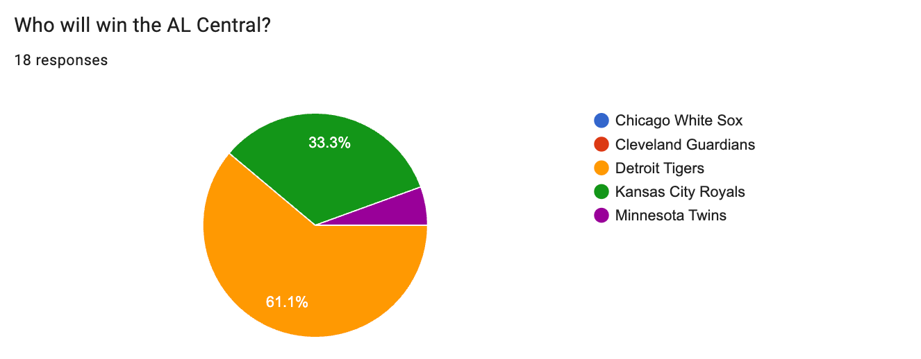 In the Central, the Detroit Tigers were the overwhelming favorites, receiving 11 votes. The Kansas City Royals received six, and the Minnesota Twins received one.