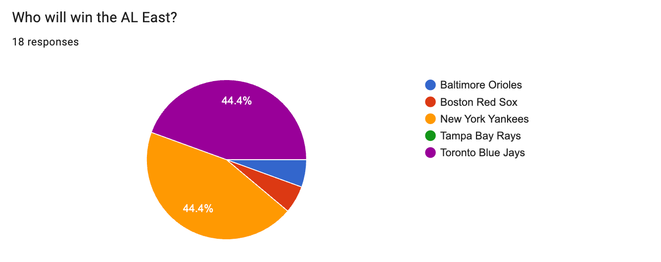 The AL East was the most divisive division. The community was evenly split between the Toronto Blue Jays and New York Yankees, who each received eight votes. The Boston Red Sox and Baltimore Orioles received the two remaining votes.