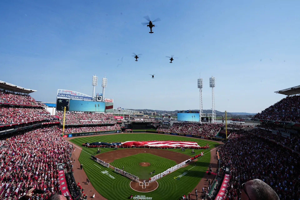 Helicopters fly over Great American Ball Park before the Cincinnati Reds face off against the Red Sox for Opening Day 2026.