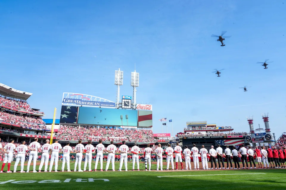 Three AH-64 Apache helicopters and one UH-60 Blackhawk helicopter from 1st Battalion, 101st Aviation Regiment, out of Fort Campbell, Kentucky, fly over during the National Anthem before the first inning of the MLB Opening Day game between the Cincinnati Reds and the Boston Red Sox at Great American Ball Park in downtown Cincinnati on Thursday, March 26, 2026. The game was tied at 0 after four innings.