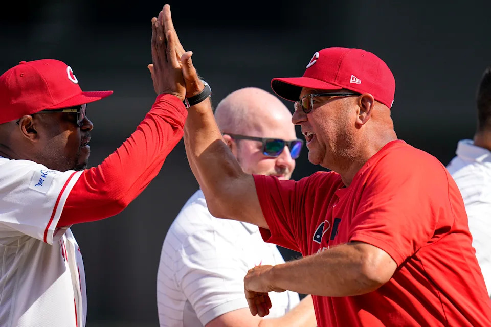 Injured Cincinnati Reds first base coach Collin Cowgill (54) high fives bench coach/field coordinator Freddie Benavides (45) before the first inning of the MLB Opening Day game between the Cincinnati Reds and the Boston Red Sox at Great American Ball Park in downtown Cincinnati on Thursday, March 26, 2026. The game was tied at 0 after four innings.
