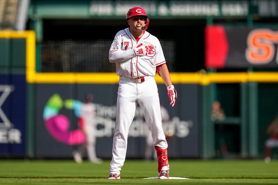 Cincinnati Reds first baseman Sal Stewart (27) celebrates after hitting a double to center field in the second inning of the MLB Opening Day game between the Cincinnati Reds and the Boston Red Sox at Great American Ball Park in downtown Cincinnati on Thursday, March 26, 2026. The game was tied at 0 after four innings.