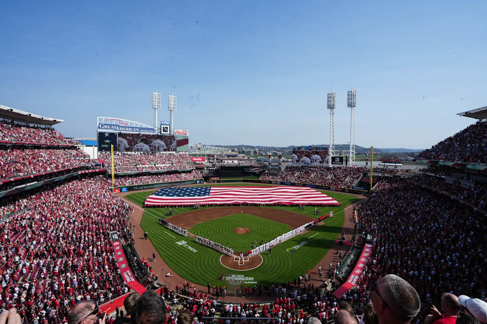 A giant flag spreads across Great American Ball Park before the Reds face off against the Red Sox for the 2026 Opening Day game.