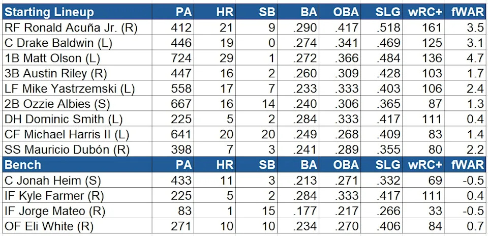 The Braves offense was in the middle of the pack last year in runs scored, although they fared better in the second half of the season. Ronald Acuña Jr. and Austin Riley each missed significant time with injury last year, but are capable of providing All-Star numbers. Matt Olson was 11th among National League hitters in fWAR, and tied for 13th in the league with 29 home runs. Michael Harris II became the 12th player in Braves history to put up a 20/20 season.