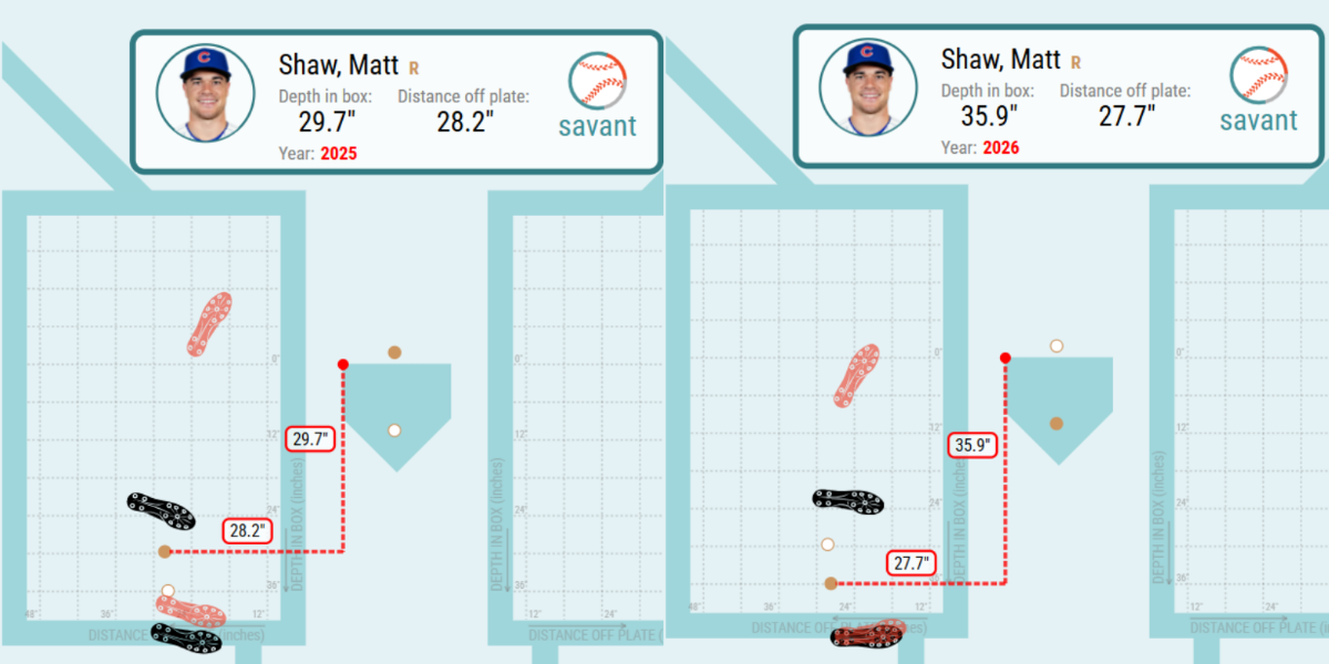 In that regard, there’s good news and bad news, so far. Shaw has made a major adjustment this spring to shorten his stride and (thereby) improve his stability in the box. That should mean better pitch recognition and a better contact rate, over time. Here’s a comparison of his stance and stride for 2025 with the one he’s shown (in an extremely limited sample, of course, but the difference is real and intentional) in 2026.