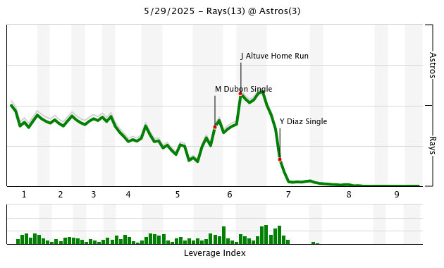 On the other side, Shane Baz mowed through Houston’s order first time through, keeping them hitless until Jeremy Peña’s second time through resulted in a double. Although Peña failed to score, Yainer Díaz (6) got Houston on the board one inning later with a home run.