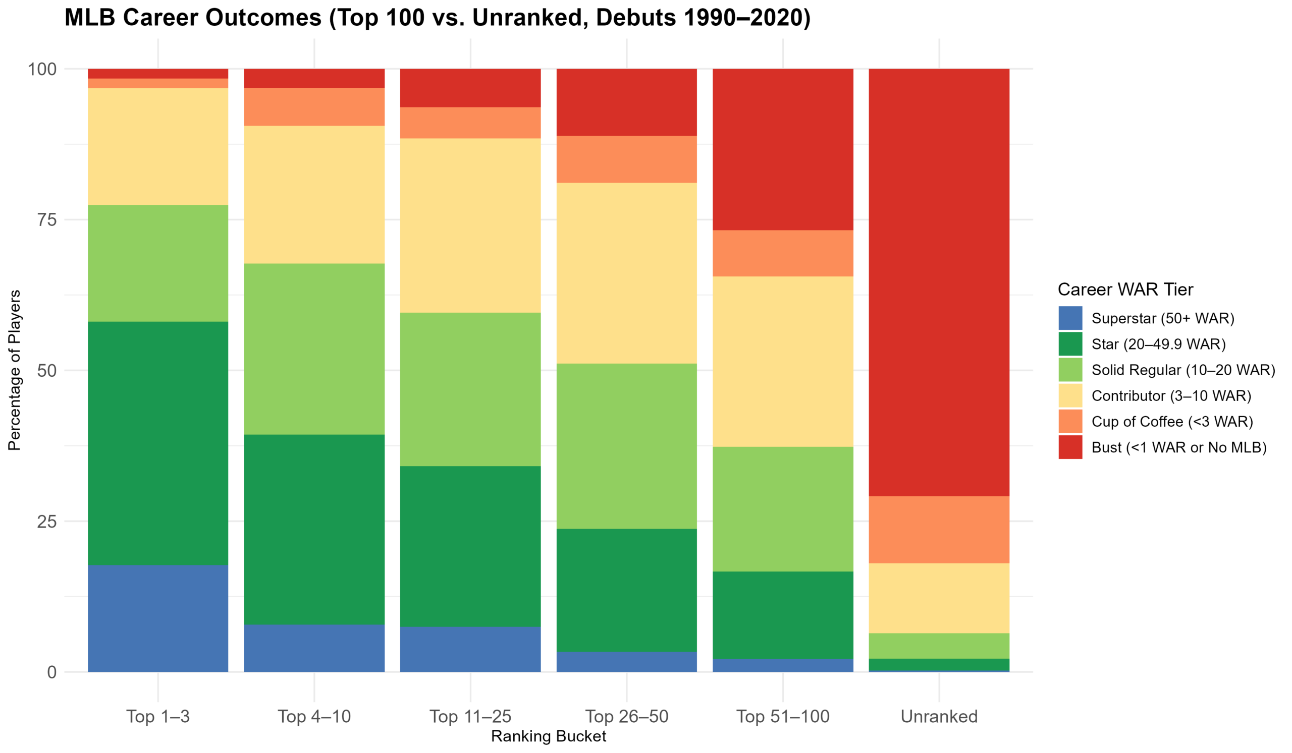 Whereas middle-of-the-pack Top 100 players like Pratt have roughly a 25% chance to become a star, players ranking in the No. 4-10 range have a 40% chance of stardom and a 2-in-3 chance of being at least a long-term solid regular. Yes, there have been plenty of players who ended up falling short of those career labels, but only 3% of this group has failed to produce 1+ career WAR. Less than 10% fails to reach 3 career WAR.