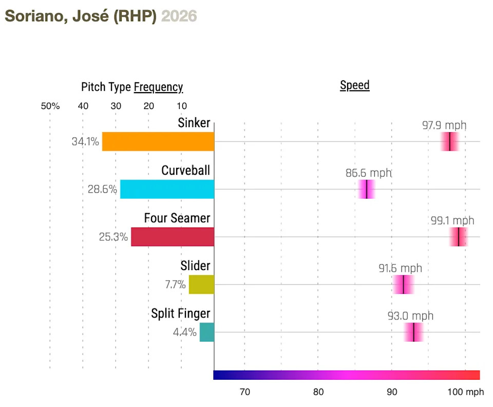 Soriano’s pitch selection chart below is from his one start this year. Taillon’s is from 2025.