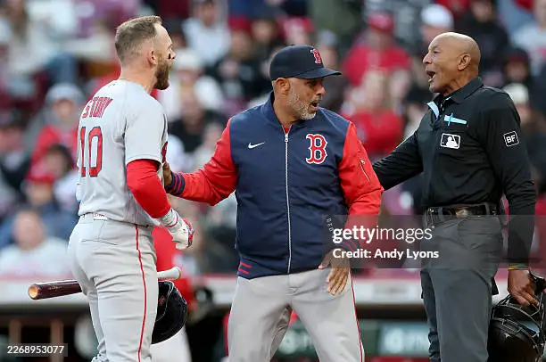 CINCINNATI, OHIO – MARCH 28: Trevor Story #10, Alex Cora the manager of the Boston Red Sox and umpire CB Bucknor have a discussion about a strike out by Story in the 8th inning during the game against the Cincinnati Reds during the game at Great American Ball Park on March 28, 2026 in Cincinnati, Ohio. (Photo by Andy Lyons/Getty Images)