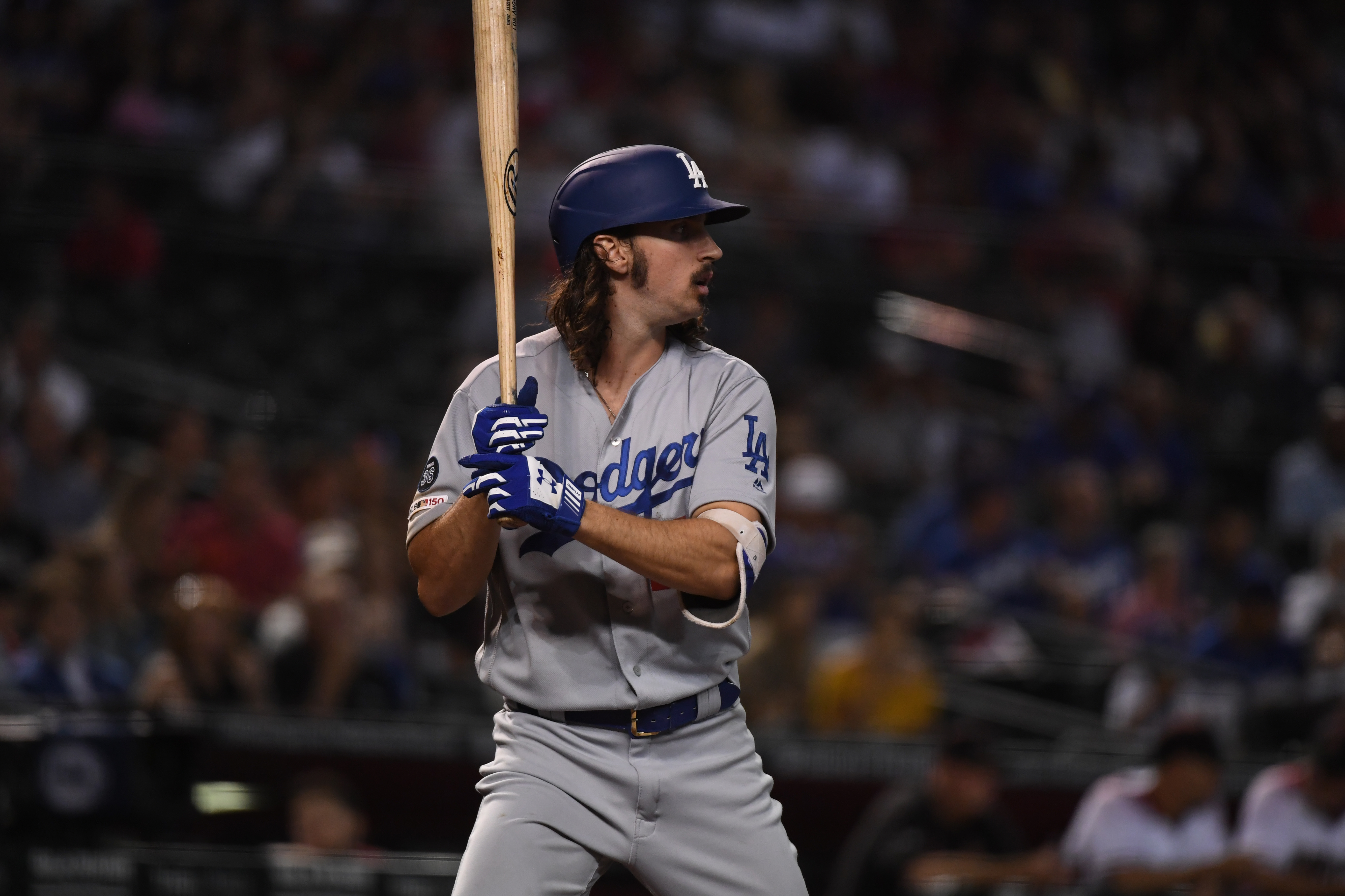 GettyTony Gonsolin #46 of the Los Angeles Dodgers gets ready in the batters box against of the Arizona Diamondbacks at Chase Field on June 26, 2019 in Phoenix, Arizona. It was Gonsolin’s first MLB at bat.