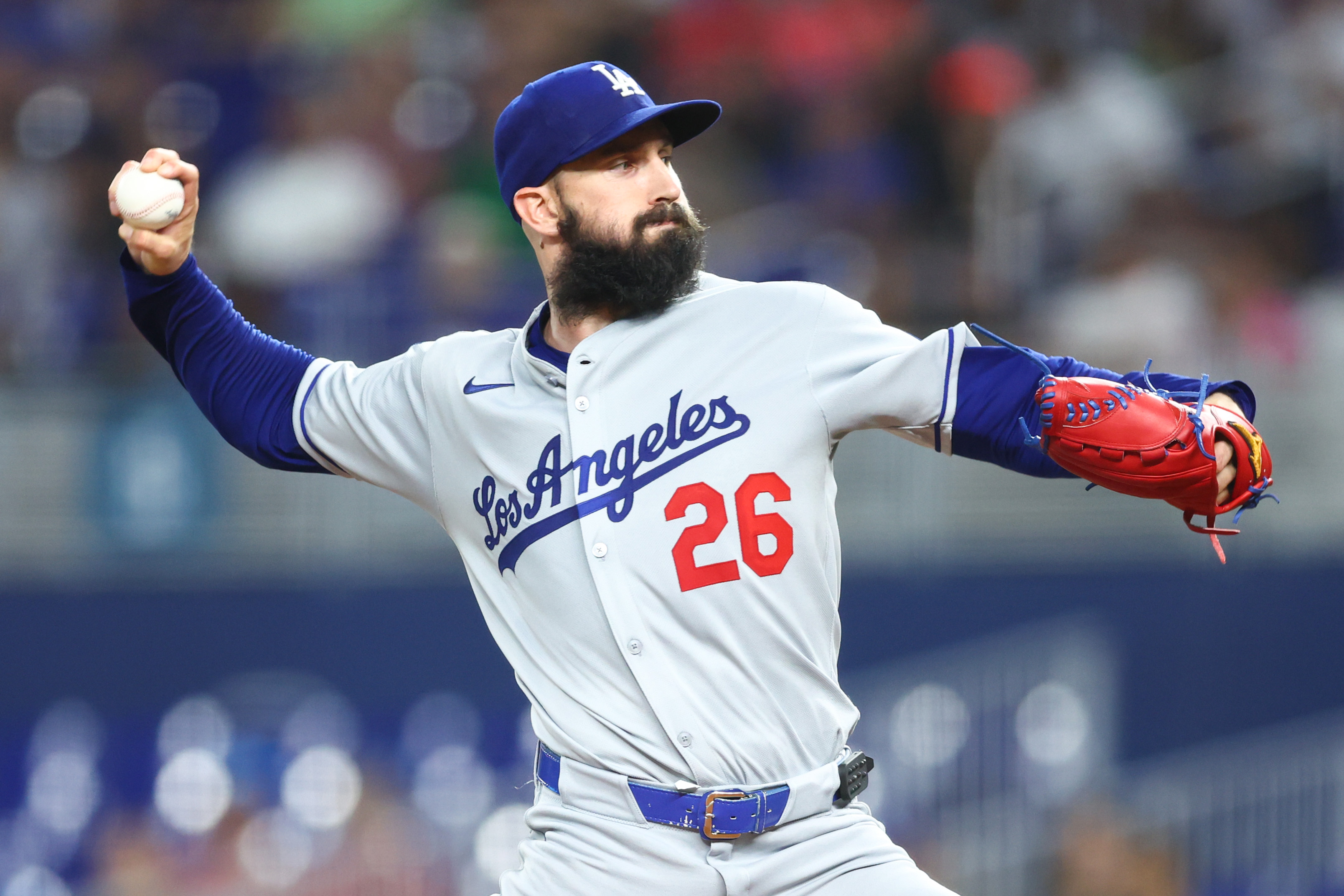 GettyTony Gonsolin #26 of the Los Angeles Dodgers pitches against the Miami Marlins in the first inning at loanDepot park on May 06, 2025 in Miami, Florida.