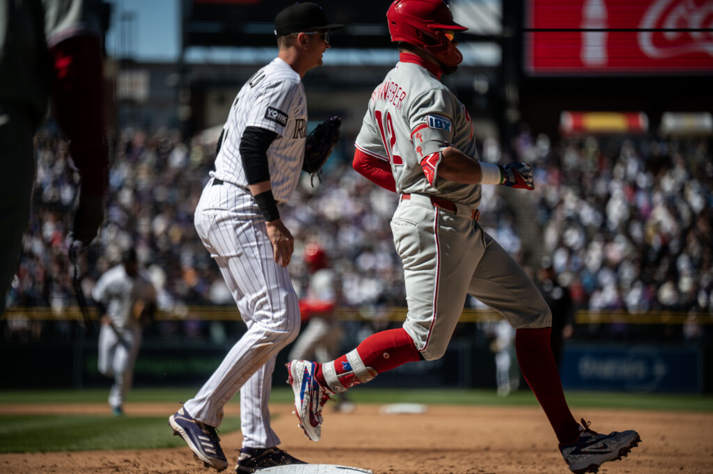 Colorado Rockies first baseman TJ Rumfield (7) waits for a throw from the outfield as Philadelphia Phillies left fielder Kyle Schwarber (12) runs by first during the Rockies home opener against the Philadelphia Phillies at Coors Field on Friday. The Rockies lost the game 10-1.
