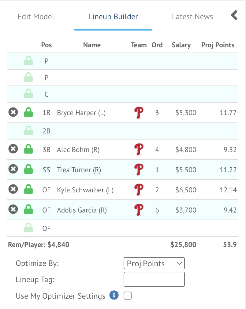 Philadelphia’s lineup is still one of the most dangerous in all of baseball. It is anchored by Kyle Schwarber and Bryce Harper, who are both capable of doing serious damage vs. right-handed pitchers. Trea Turner also has an appealing combination of power and speed at the top of the lineup, while Alec Bohm and Adolis Garcia round out the top projected stack.