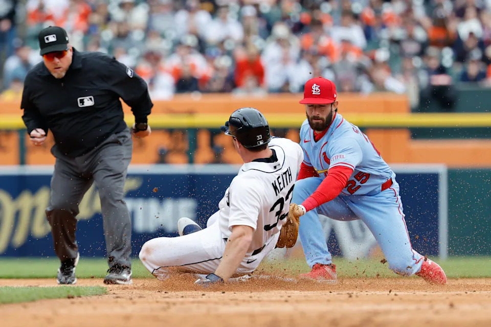 Detroit Tigers second baseman Colt Keith (33) is tagged out by St. Louis Cardinals second baseman Thomas Saggese (25) at second in the second inning at Comerica Park in Detroit on Saturday, April 4, 2026.