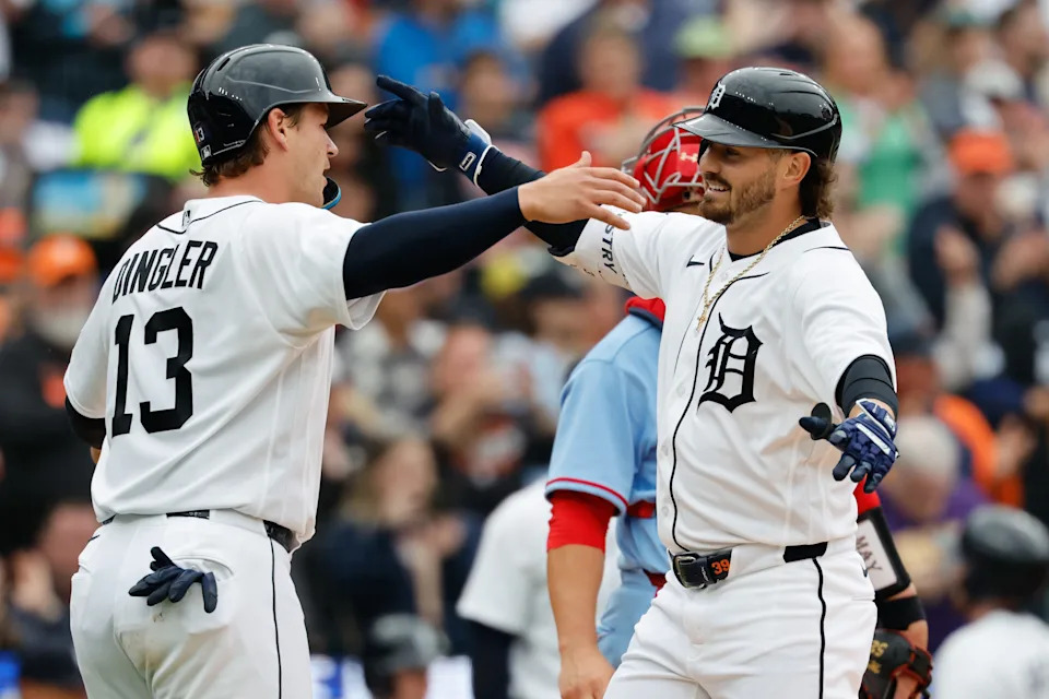 Detroit Tigers third baseman Zach McKinstry (39) receives congratulations from catcher Dillon Dingler (13) after he hits a two run home run in the fourth inning against the St. Louis Cardinals at Comerica Park in Detroit on Saturday, April 4, 2026.