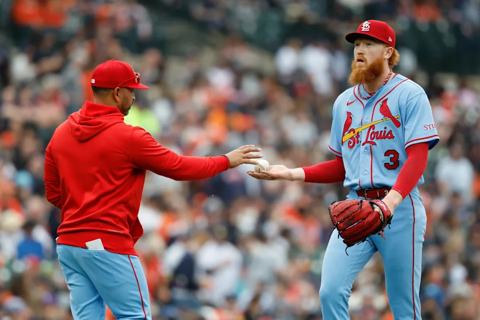 St. Louis Cardinals manager Oliver Marmol (37) takes the ball to relieve Dustin May (3) in the fourth inning against the Detroit Tigers at Comerica Park in Detroit on Saturday, April 4, 2026.