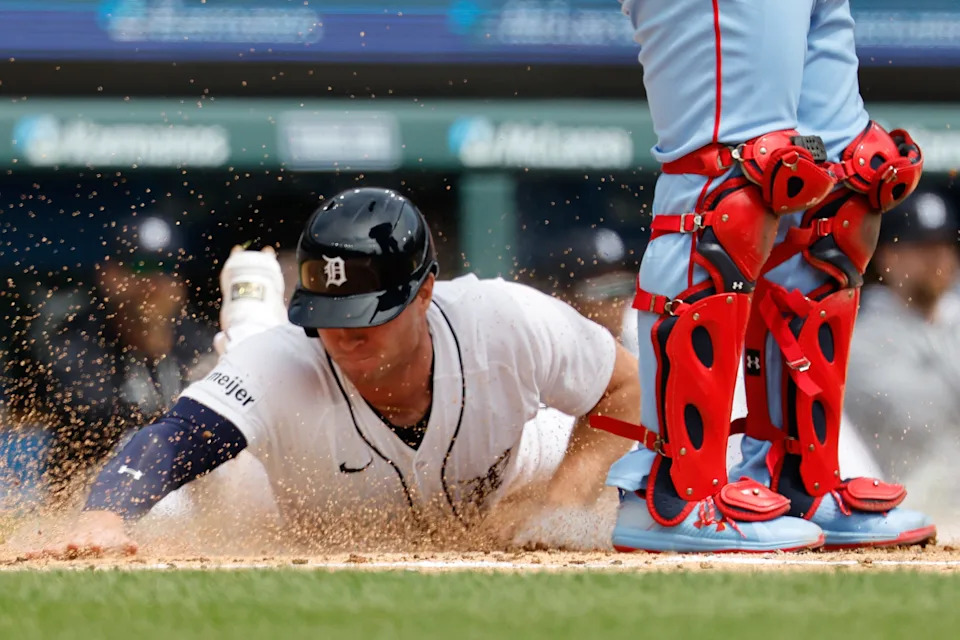 Detroit Tigers second baseman Colt Keith (33) dives in safe at home in the first inning against the St. Louis Cardinals at Comerica Park in Detroit on Saturday, April 4, 2026.
