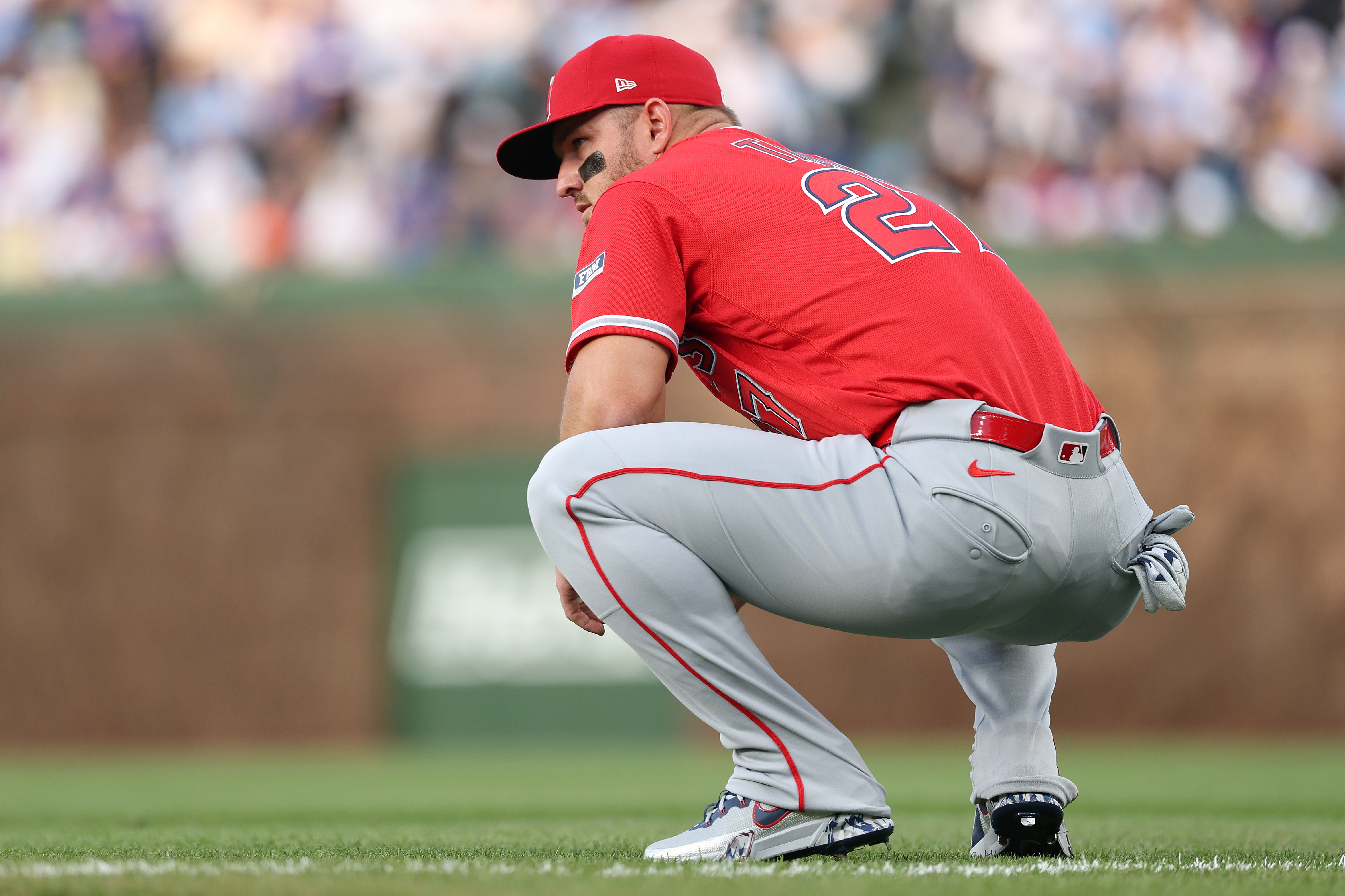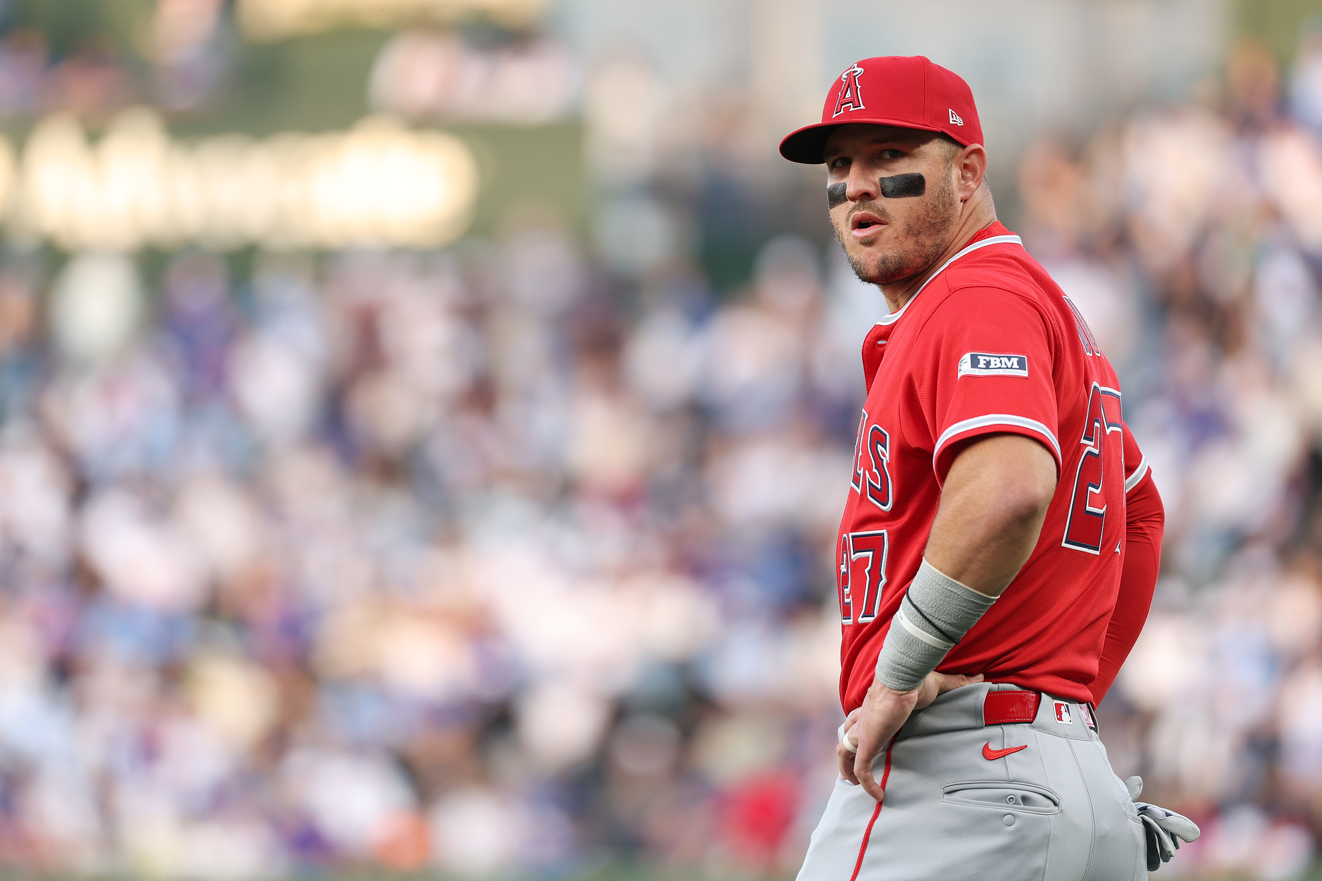 GettyMike Trout #27 of the Los Angeles Angels looks on prior to the game against the Chicago Cubs at Wrigley Field on March 30, 2026 in Chicago, Illinois.