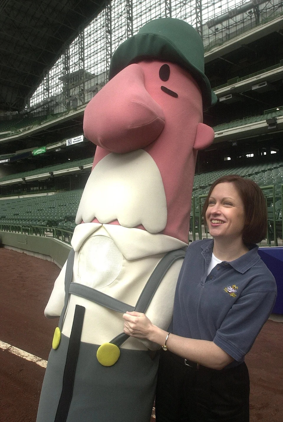 In April, 2002, Miller Brewing marketing financial analyst Joan Piatt, posed with the bratwurst costume at Miller Park. Piatt won a writing contest giving her the chance to compete in a sausage race during an upcoming game.