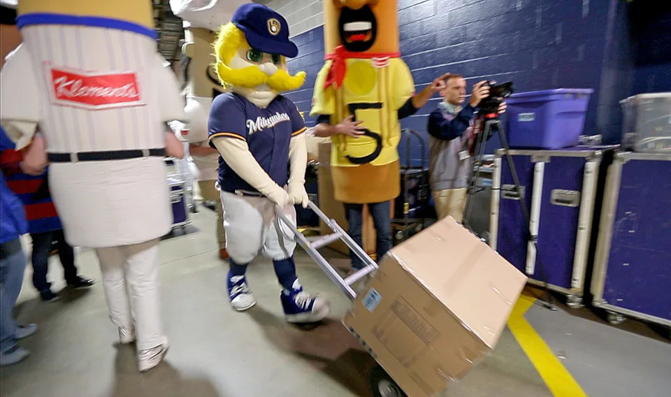 Bernie Brewer is surrounded by Racing Sausages and media on Feb. 2, 2017, as he loads a box onto a truck heading to the Brewers spring training home in Phoenix, Ariz.