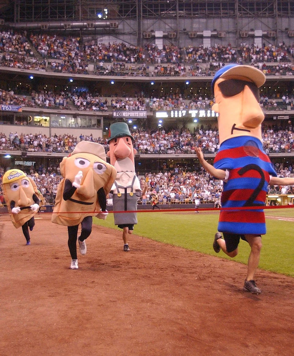 The Brewers Racing Sausages in full stride at Miller Park during the Brewers game against the Chicago Cubs on June 25, 2013. The mascots are celebrating their 20th year with the Brewers.