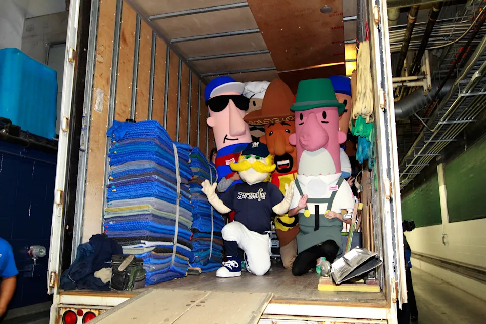Bernie Brewer and the Racing Sausages help load the Milwaukee Brewers team equipment truck on Feb. 4, 2025, at American Family Field in Milwaukee before heading to Phoenix, Ariz. for spring training.