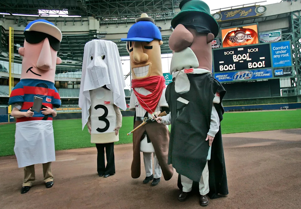 The Milwaukee Brewers Racing Sausages went trick or treating in 2006 dressed as a butcher, a ghost, a cowboy and Zorro. They will be offering treats as they go door-to-door in several neighborhoods.