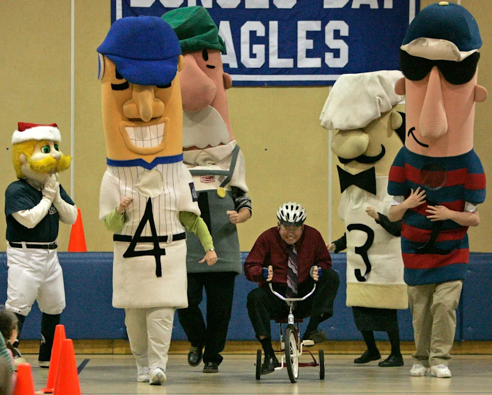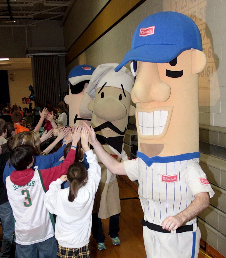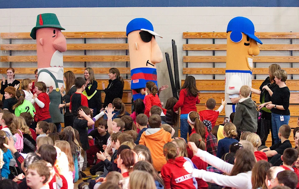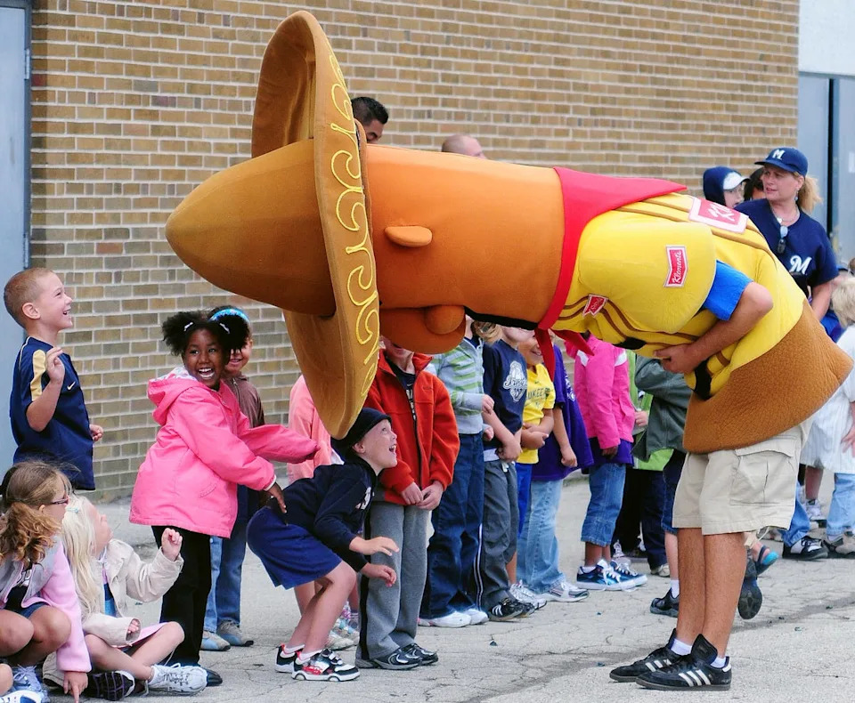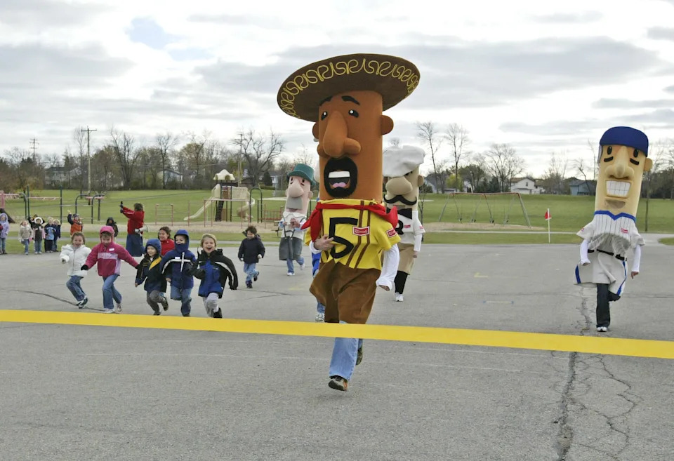 The Milwaukee Brewers Racing Sausages race with first graders at Meadowview School on Nov. 15, 2007. The mascots visited the first graders as part of a celebrity reader program.