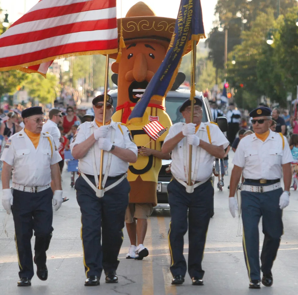 The Milwaukee Brewers Chorizo Racing Sausage walks behind flag bearers during the Fourth of July parade on Friday July 2, 2010 in West Allis.