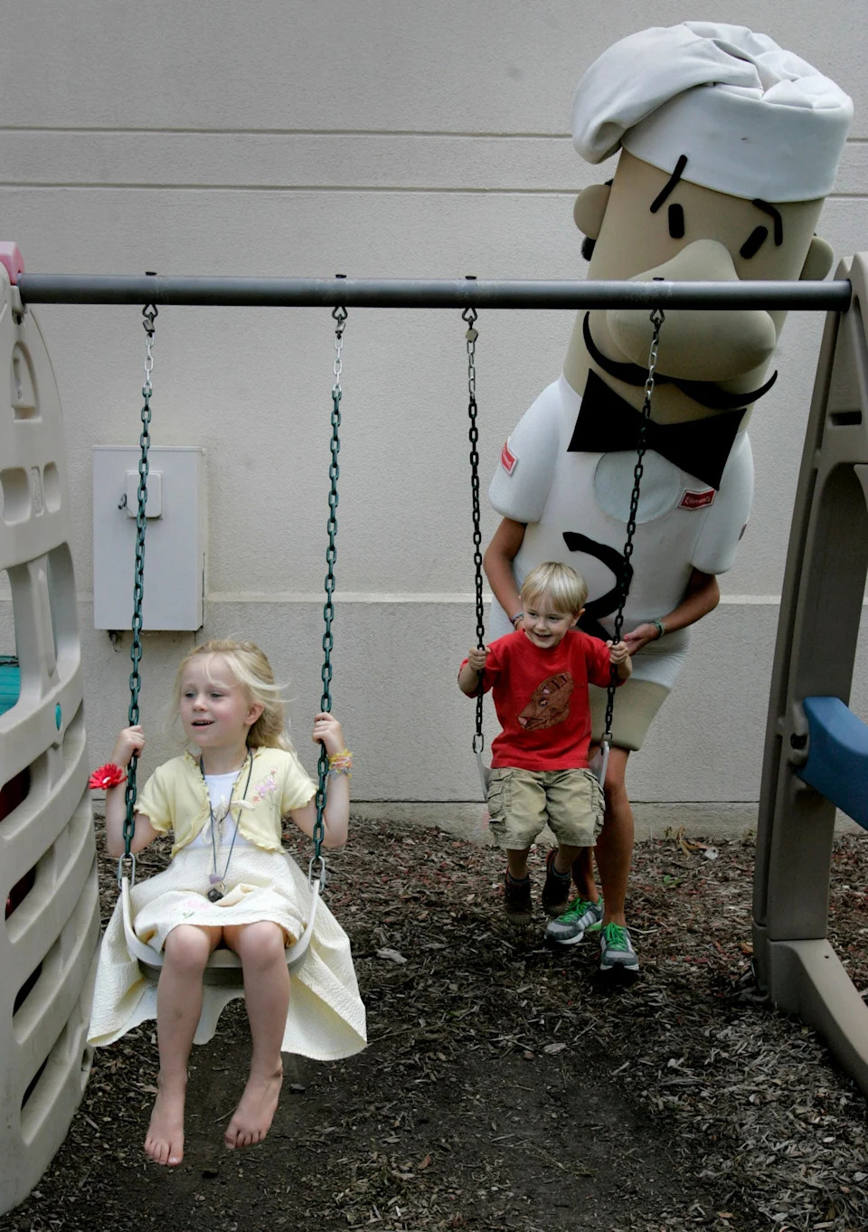 The Italian Sausage helps Skylar Smith, 5 (left), and Krystan Hansen, 3, on the swings during a visit to LindenGrove for the annual resident and family picnic on Aug. 11, 2011.