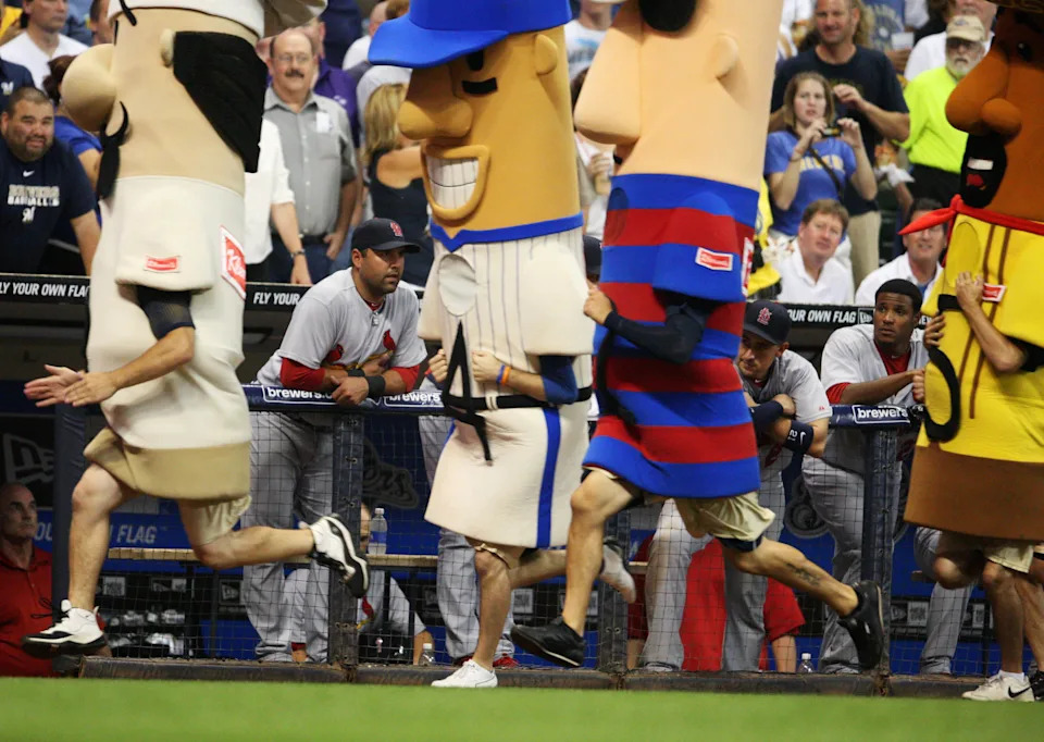 The Brewers Racing Sausages perform during a Brewers and St. Louis Cardinals game on Aug. 31, 2011.