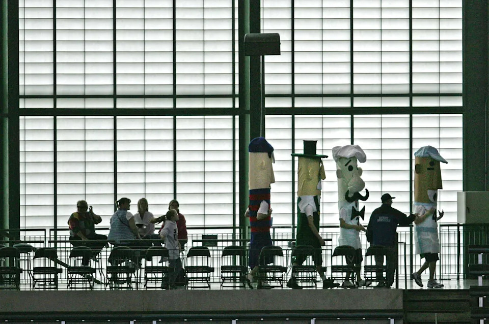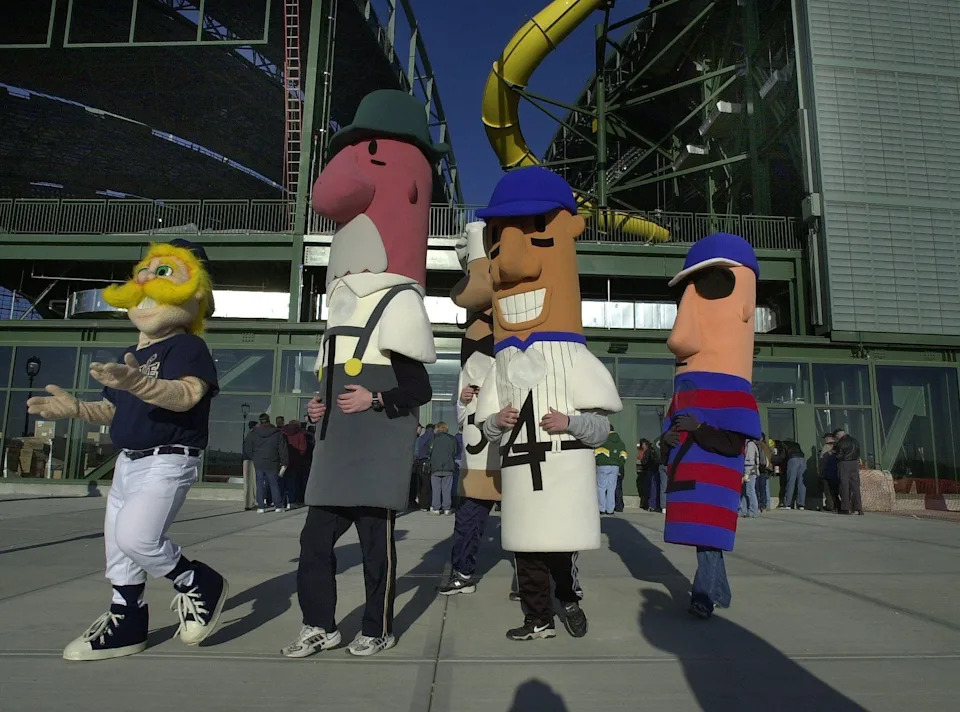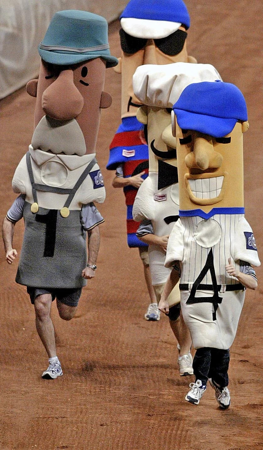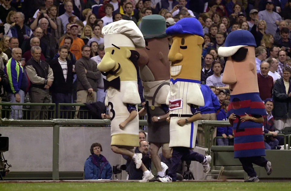 The racing sausages make an appearance near the bleachers at Miller Park, prior to the Milwaukee Brewers game with the Pittsburgh Pirates on April 13, 2005.