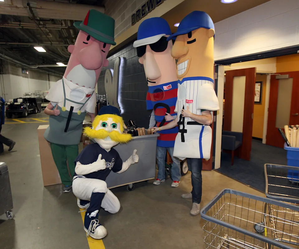 The Racing Sausages (from left) Hot Dog, Bratwurst, Polish, Chorizo, Bernie Brewer and the Italian were all on hand at Miller Park to help with loading the truck as the Brewers packed up for Spring Training on Feb. 9, 2016.