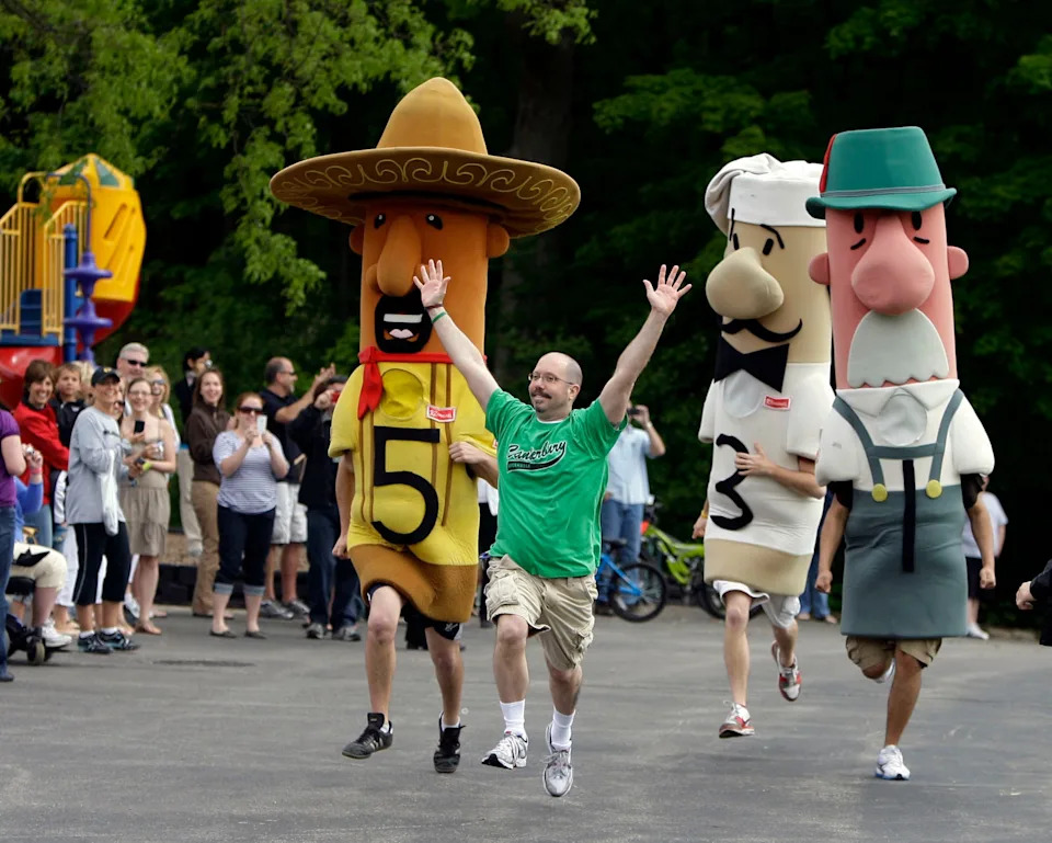 Greendale Canterbury Elementary School principal Christian Pleister leads the Brewers Racing Sausages to the finish line before hundreds of students during the start of Olympic Day at the school on June 2, 2011. Students participated in football toss, a potato sack race, jump rope, a jelly bean race and a Kickball game.